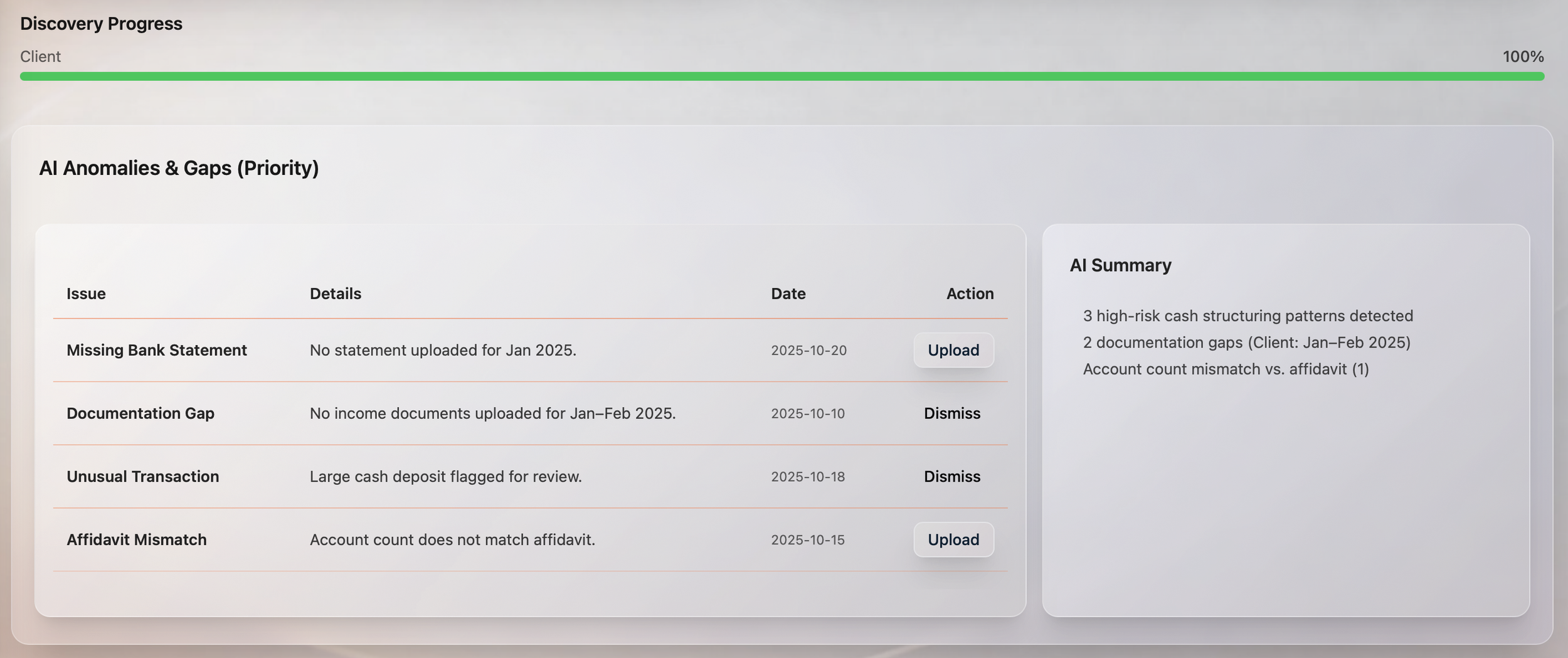 Our AI-powered platform parses requests, generates financial statements, organizes evidence, and reveals discrepancies—in a fraction of the time.