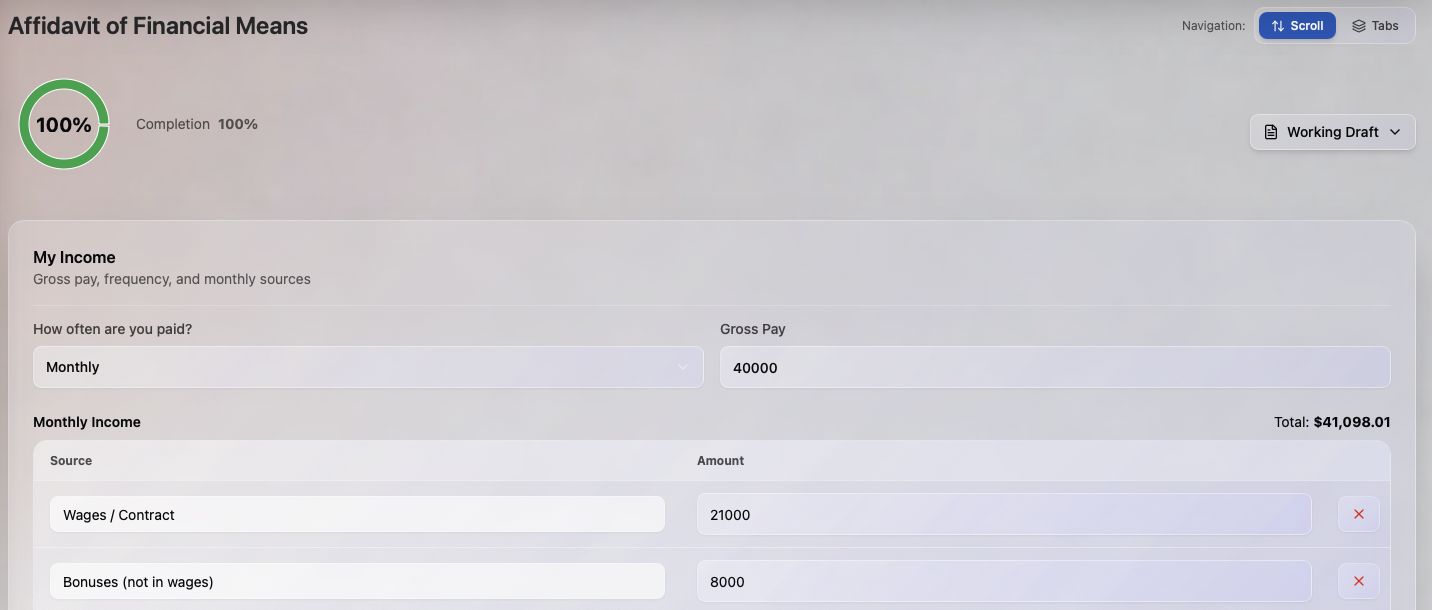 See assets, liabilities, income, and support calculations clearly summarized—giving you and your clients a shared, defensible financial picture.